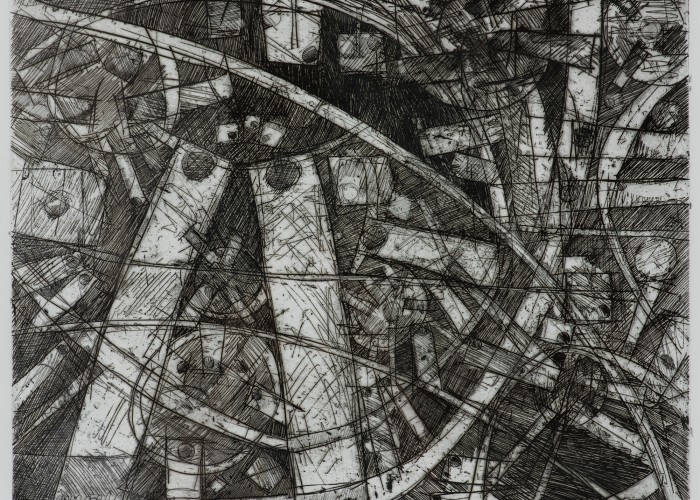 This exhibition brings together an unlikely combination of Roger Kemp and Howard Arkley. Like many artists, the two share a passion for music. Kemp was interested in the Steiner idea of Eurythmy or visible music and became pre-occupied with ideas of pattern and rhythm. Howard Arkley is represented by a major early work, Seltsamer, (1975) which dates from his very first exhibition at Tolarno Gallery in Melbourne. At the time that he was producing delicate black and white works, and experimenting with the range of marks available using an airbrush. This work and the accompanying drawings bring to mind sparse musical notation or the wave patterns of a vibrating string.